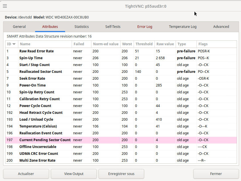 On voit que la dernière erreur a eu lieu au bout de 8224 heures alors que le disque a été en marche pendant 11940 heures et qu’jourd’hui il est PASSED donc bien.