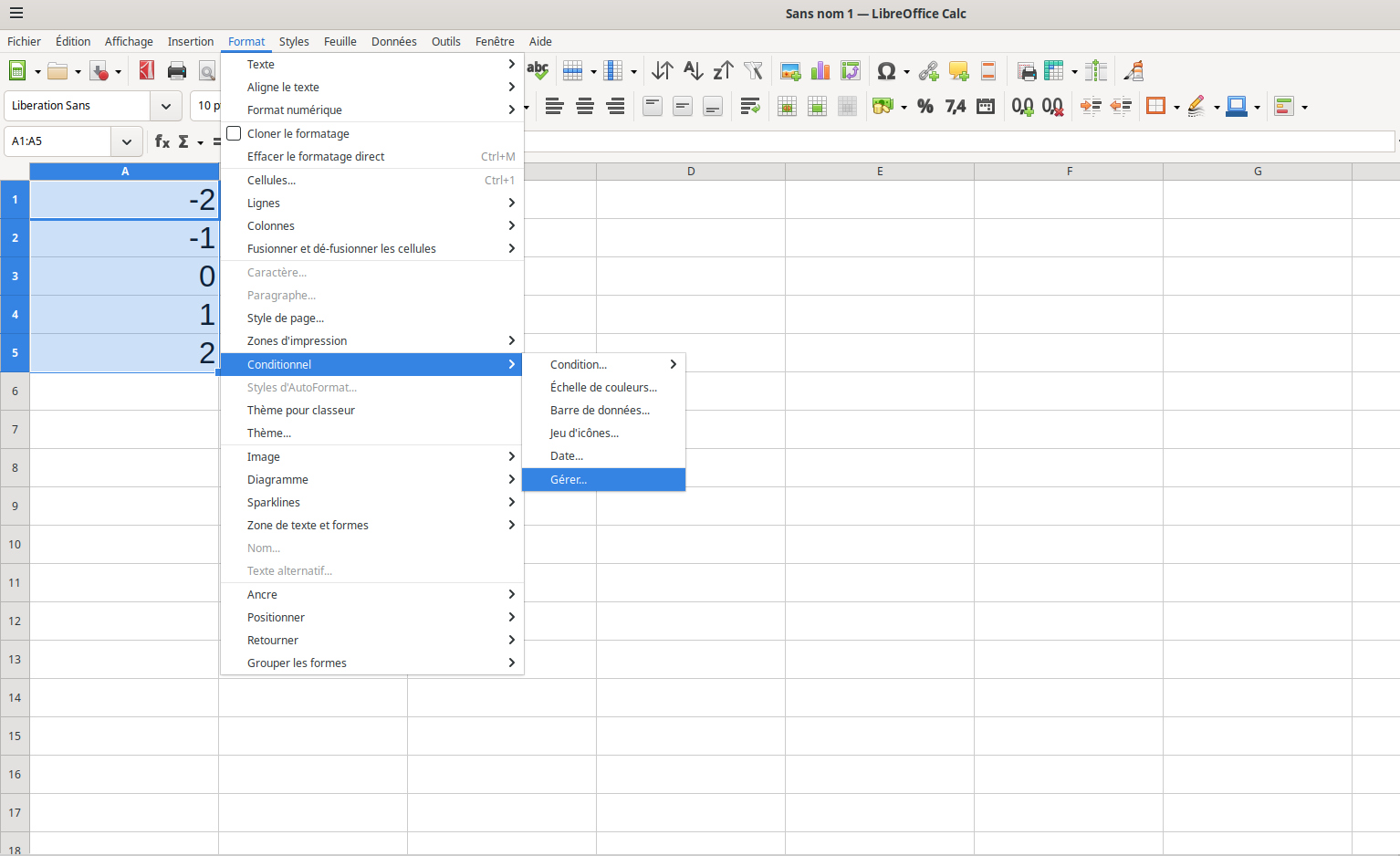 On sélectionne tous les nombres et on Format::Conditonnel::Gérer