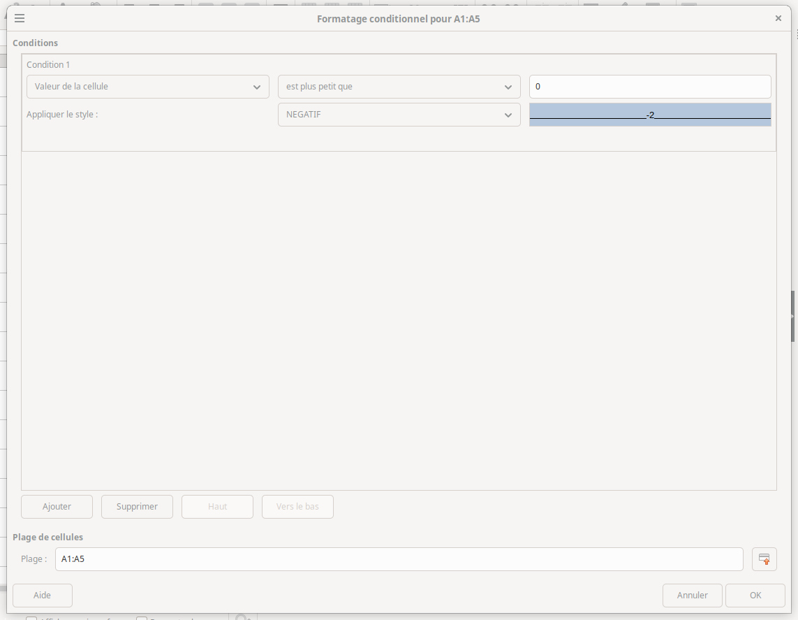 On appuie sur ajouter et ion crée la première condition , exemple avec est plus petit que 0 et style NEGATIF :