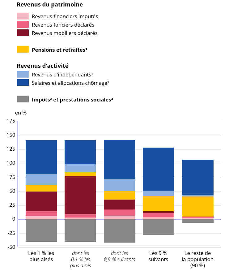 | Revenus | Les 1 % les plus aisés | dont les 0,1 % les plus aisés | dont les 0,9 % suivants | Les 9 % suivants | Le reste de la population (90 %) |